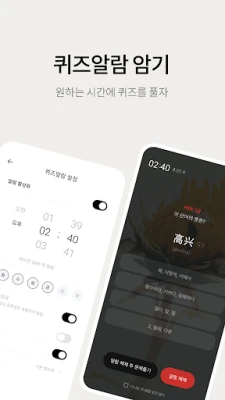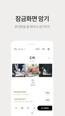 바쁜 일상 속에서도 중국어 학습의 끈을 놓지 않도록, '저절로암기 중국어'는 독창적인 암기 시스템을 제공합니다. 휴대폰을 켤 때마다 잠금화면에서 새로운 단어들을 마주하며 자연스럽게 반복 학습 효과를 극대화할 수 있습니다. 또한, 원하는 시간에 맞춰 주기적으로 도착하는 퀴즈 알림은 학습 동기를 유발하고, 실제 자신의 실력에 맞는 단어장을 선택하여 풀어볼 수 있게 합니다. 이 모든 과정은 학습 통계로 기록되어, 사용자 스스로 자신의 성장 과정을 명확하게 확인할 수 있습니다.
