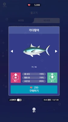 정답을 맞힐 때마다 얻는 성취감은 나만의 특별한 수족관을 꾸미는 즐거움으로 이어집니다. 아름다운 물고기들을 입양하고, 그들이 유유히 헤엄치는 모습을 따라 카메라로 담아보세요. 때로는 화면을 확대하거나 축소하여 작은 지느러미의 움직임까지 세밀하게 관찰하며 생동감 넘치는 나만의 해양 세계를 완성해갈 수 있습니다. 퀴즈와 함께 눈과 귀를 즐겁게 할 5종의 감성적인 배경음악 또한 당신의 몰입을 더해줄 것입니다.