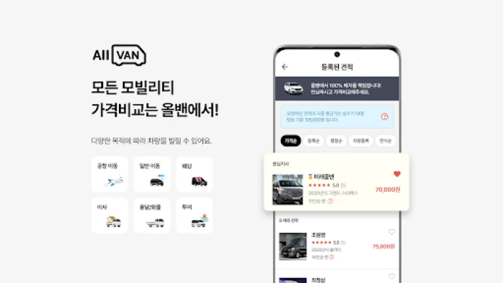 갑작스러운 이동, 복잡한 짐 운반, 중요한 행사 준비까지. 이동 수단이 필요할 때마다 막막하셨나요? 올밴은 콜밴, 택시, 공항 리무진, 웨딩카, 이사 및 용달 서비스까지, 다양한 이동 솔루션을 한곳에서 비교하고 예약할 수 있는 스마트한 플랫폼입니다. 불확실한 요금 걱정은 이제 그만! 올밴은 투명한 가격 비교와 100% 배차 보장을 통해 언제나 믿을 수 있는 서비스를 제공합니다. 친절한 기사님들의 높은 평점(평균 4.9점)은 올밴이 추구하는 최상의 고객 경험을 대변합니다. 365일 24시간, 가장 합리적인 비용으로 편안한 여정을 시작해보세요.